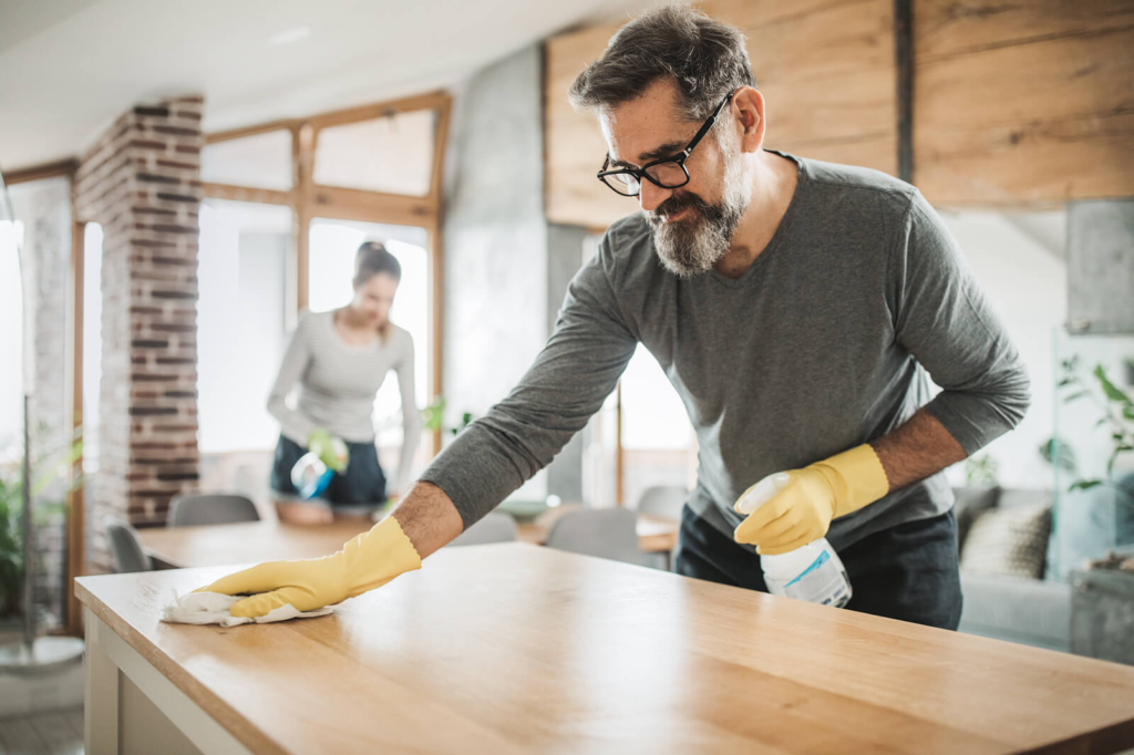 - Dùng khăn ẩm lau sạch bề mặt nội thất như bàn ghế, sàn nhà, tủ gỗ ít nhất 2 lần/tuần.