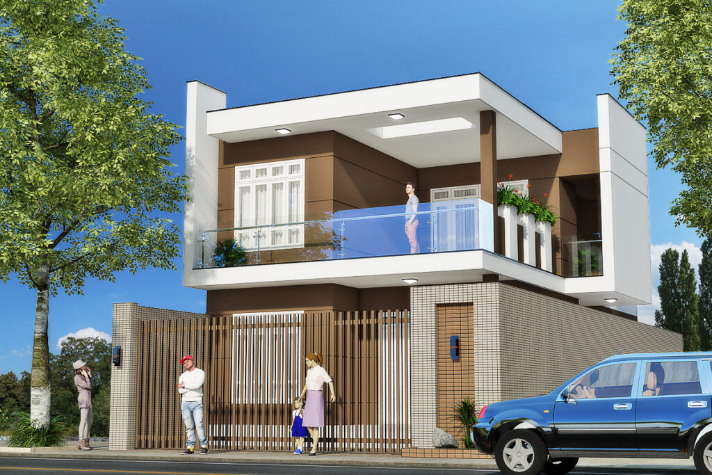 Căn biệt thự gây ấn tượng ngay từ ánh nhìn đầu tiên với những đường nét khỏe khoắn, hình khối vuông vức, mảng tường nâu – trắng phối hợp hài hòa, mang lại cảm giác vững chãi mà không kém phần tinh tế. Ban công kính cường lực trong suốt góp phần tăng độ mở cho không gian, kết nối mạnh mẽ với thiên nhiên bên ngoài.
