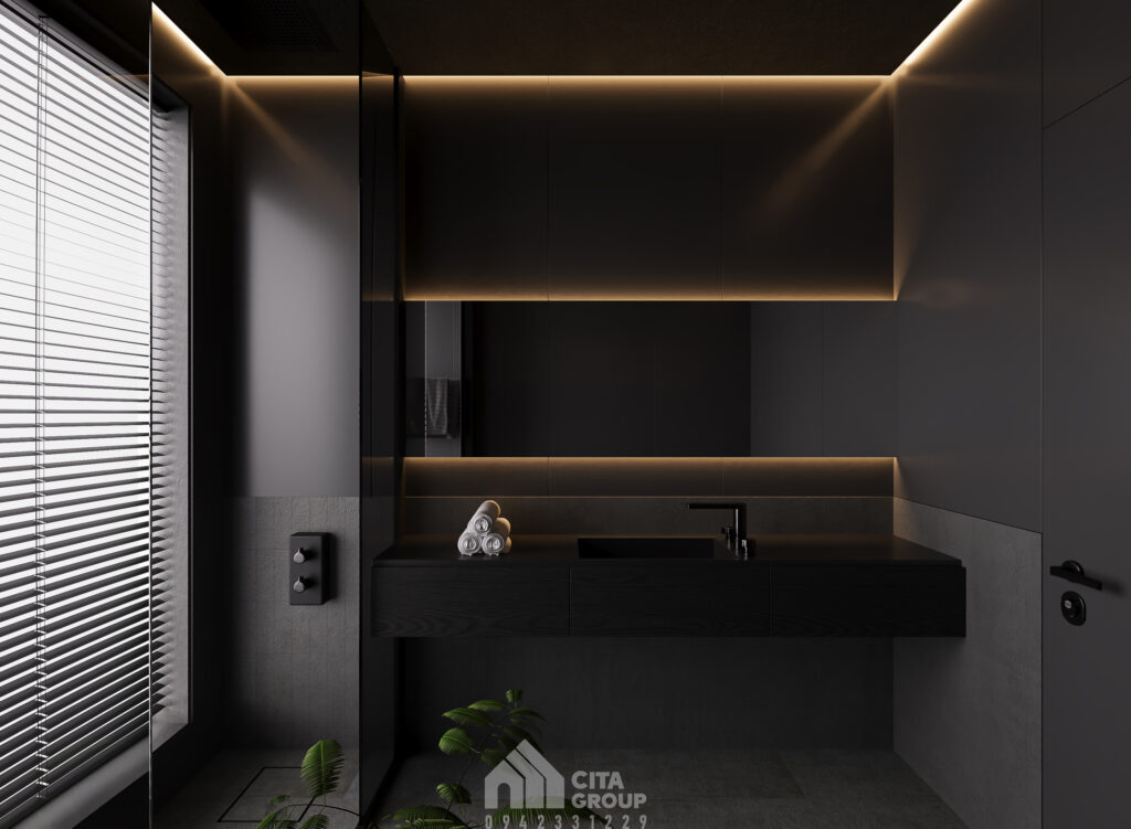 Phòng ngủ tiếp nối tinh thần thiết kế chủ đạo: nhẹ nhàng, thanh thoát nhưng vẫn đầy đủ tiện nghi. Giường bọc nệm mềm, tủ cao kịch trần, đèn ngủ âm trần – tất cả được bố trí hợp lý, tạo nên một nơi nghỉ ngơi vừa riêng tư, vừa tràn đầy năng lượng tích cực.Phòng ngủ được thiết kế gần cửa sổ lớn giúp đón ánh sáng tự nhiên tối đa. Giường ngủ bọc nệm ghi sáng, tích hợp hộc kéo bên dưới để tăng không gian lưu trữ. Tủ quần áo cao kịch trần giúp tận dụng chiều cao trần và tạo cảm giác gọn gàng, ngăn nắp.Gam màu chủ đạo trong phòng ngủ là trắng và ghi sáng, kết hợp cùng một vài chi tiết gỗ tạo điểm nhấn nhẹ nhàng, phù hợp với tinh thần thư giãn – nghỉ ngơi của không gian cá nhân.Phòng vệ sinh được thiết kế tối giản với gam màu đen lạnh lùng sang trọng, bố cục gọn gàng. Vách kính ngăn khu tắm giúp không gian luôn khô ráo, sạch sẽ. Từng chi tiết nhỏ như gương, vòi sen, tủ lavabo đều được lựa chọn kỹ lưỡng, đảm bảo tiện nghi và thẩm mỹ.