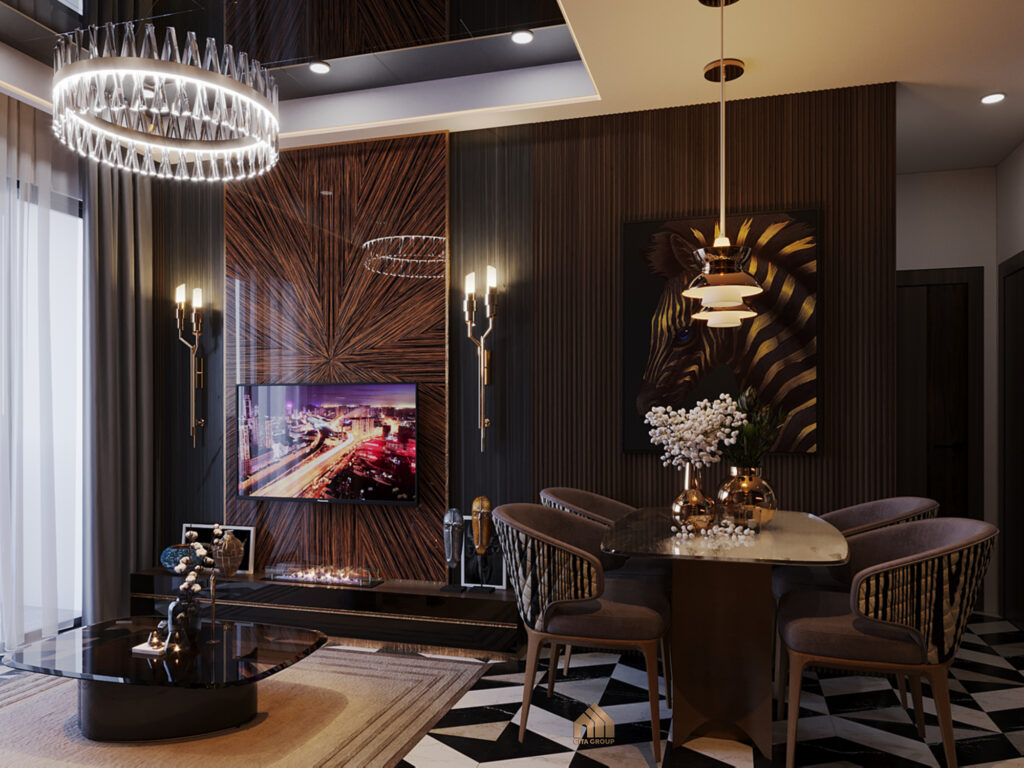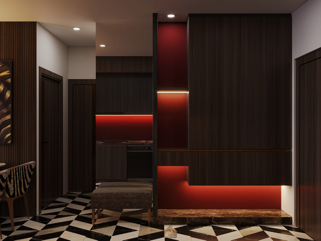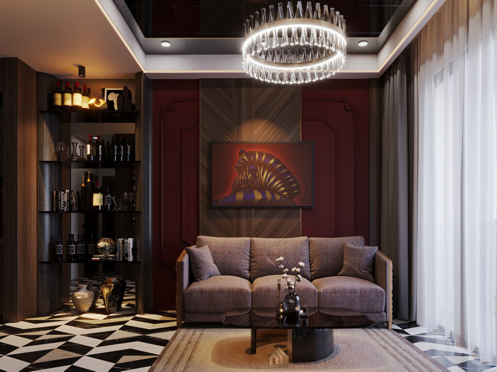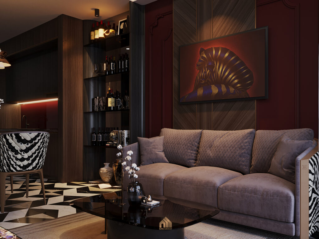 Bước vào căn hộ, bạn sẽ bị thu hút ngay bởi không gian phòng khách nhờ cửa sổ lớn mở ra ban công. Ánh sáng tự nhiên kết hợp với tông màu trầm nâu – xám đậm của nội thất tạo cảm giác bí ẩn, sang trọng.Đối diện với màn hình tivi hiện đại và khu vực bàn ăn ấm cúng là một ‘bộ sưu tập’ rượu quý được bài trí trang trọng trên hệ kệ, tạo nên một điểm nhấn thị giác đầy bất ngờ và thể hiện gu thưởng lãm tinh tế của gia chủ. Sofa chữ I vừa tiết kiệm diện tích, vừa tạo không gian sinh hoạt chung thoải mái cho cả gia đình. Bức tranh nghệ thuật treo trên tường ngay phía sau sofa trở thành điểm nhấn thị giác, tạo chiều sâu và sức hút cho căn phòng.Tivi treo tường với hệ vách được ốp gỗ với lớp kính bóng kết hợp với đèn tường nghệ thuật hai bên tạo nên một vẻ trang trọng khác thường, vừa có chút hiện đại lại pha chút cổ điển.Góc nhìn từ phòng khách ra cửa chính và khu phòng bếp, không gian liền mạch thông thoáng.