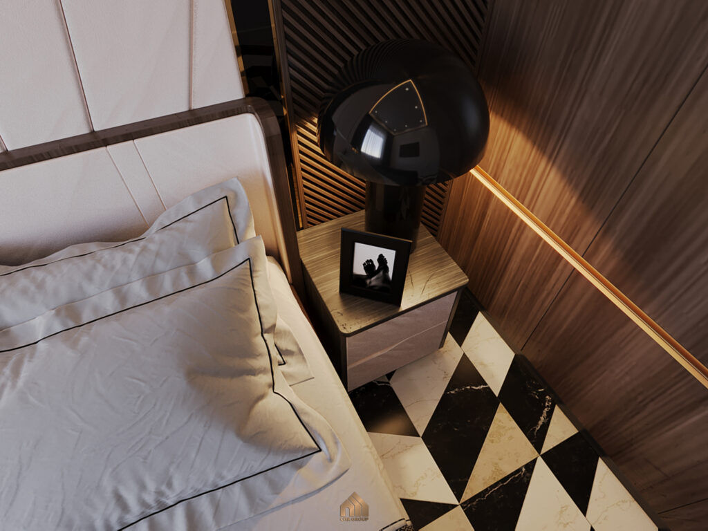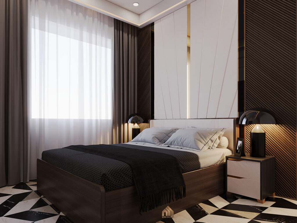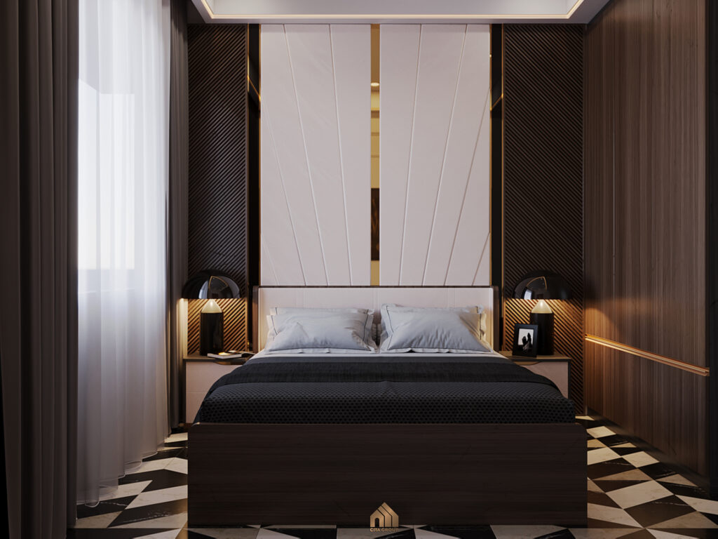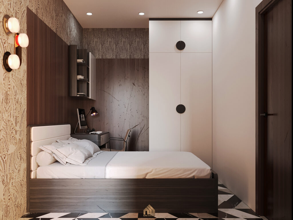 Phòng ngủ mang phong cách nhẹ nhàng, vẫn là tông màu trắng – nâu – xám đen đơn giản nhưng không đơn điệu. Hệ tủ quần áo thiết kế chạm trần, cánh tủ kín với hoạ tiết vân gỗ sọc màu nâu đậm cảm giác rất gọn gàng.Ánh nhìn bị cuốn hút ngay lập tức vào hệ vách đầu giường gỗ công nghiệp, nơi sắc nâu và trắng giao thoa một cách nhịp nhàng, tạo nên một khung nền trang nhã. Chi tiết bản lề kim loại không chỉ là yếu tố kỹ thuật mà còn là điểm nhấn ánh lên vẻ đẹp hiện đại và sự chăm chút tỉ mỉ.Đặt đối xứng trên hai đôn đầu giường là hai chiếc đèn bàn, vừa cung cấp ánh sáng dịu nhẹ cho những phút giây thư giãn cuối ngày, vừa góp phần tô điểm thêm vẻ đẹp cân bằng và trang nhã cho phòng ngủ.Đèn kiểu dáng hiện đại thú vị mang lại cảm giác hài hoà cho căn phòng.