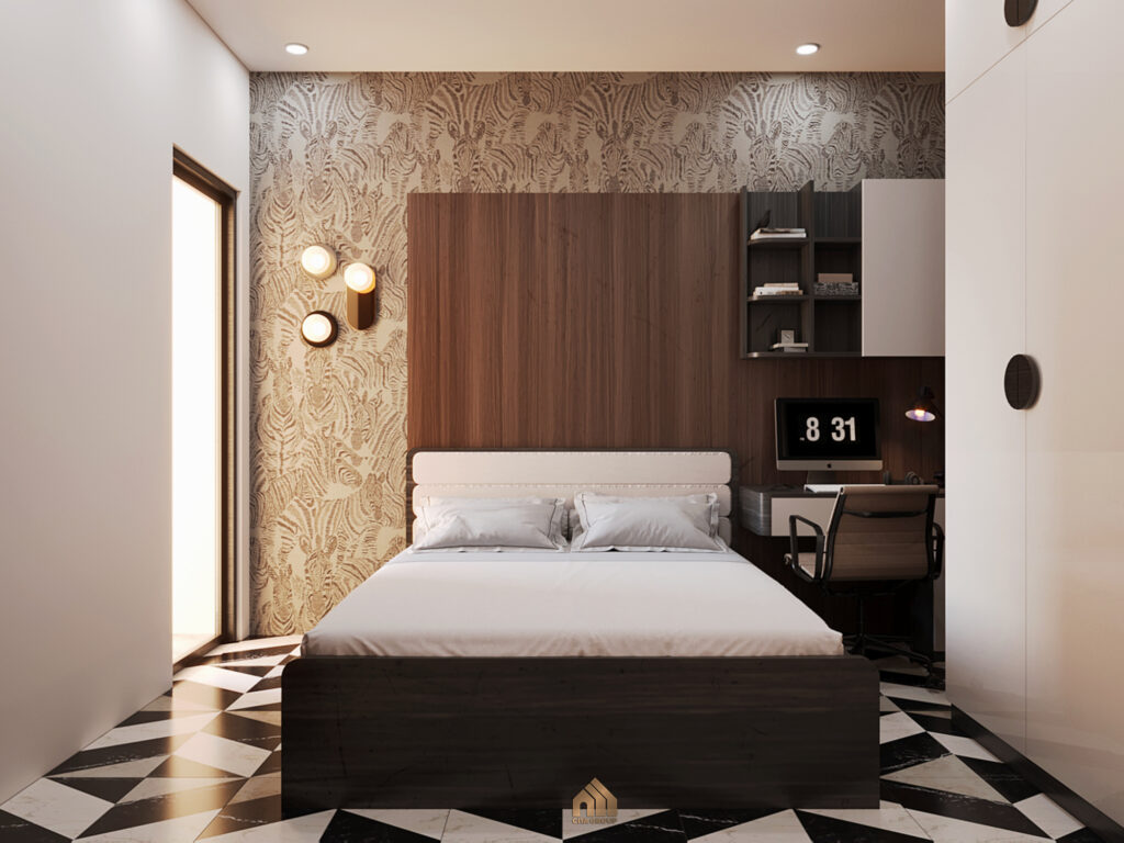 Phòng ngủ phụ này mang đậm dấu ấn cá nhân với sự pha trộn giữa các mảng tường trang trí khác nhau, tạo nên một không gian sinh động và không nhàm chán. Bố cục phòng được sắp xếp gọn gàng, tối ưu hóa diện tích.Giường ngủ đôi với phần khung giường thấp, có vẻ được làm từ gỗ công nghiệp màu nâu sẫm, tạo sự chắc chắn và hiện đại. Đầu giường bọc nệm màu trắng kem, có các đường kẻ sọc dọc tạo điểm nhấn đơn giản nhưng tinh tế. Mảng tường phía đầu giường được ốp gỗ công nghiệp màu nâu vân gỗ dọc, tạo cảm giác ấm áp và chiều sâu cho không gian.Một chiếc bàn học/làm việc nhỏ gọn với mặt bàn màu trắng được đặt sát tường. Một chiếc ghế xoay màu xám được đặt ngay ngắn trước bàn. Phía trên bàn là một hệ kệ treo tường đơn giản với các ngăn để đồ trang trí hoặc sách vở. Một chiếc tủ quần áo cánh lùa lớn màu trắng được đặt ở góc phòng, giúp tiết kiệm diện tích và tạo sự gọn gàng cho không gian. Tay nắm tủ là các hình tròn màu đen tương phản.