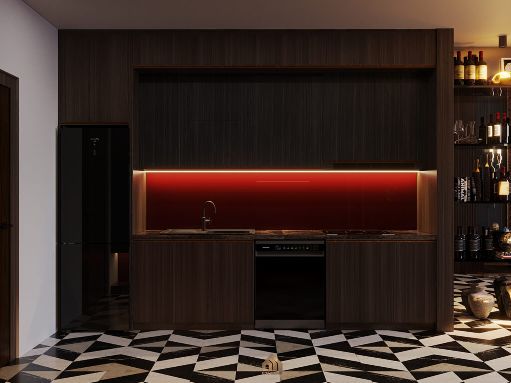 Ngay cạnh bếp là khu bàn ăn 4 chỗ, được chiếu sáng bởi đèn thả kiểu dáng hiện đại. Thiết kế không gian mở giúp các khu chức năng liên kết mạch lạc, thuận tiện trong sinh hoạt và tạo cảm giác rộng hơn cho căn hộ. Bếp được thiết kế theo phong cách tối giản nhưng vẫn toát lên vẻ sang trọng và tiện nghi. Sự kết hợp hài hòa giữa các gam màu trầm ấm và ánh sáng tạo nên một không gian ấm cúng và thư thái.Hệ tủ bếp chữ I chạy dọc song song hai bên tường, sử dụng chất liệu gỗ công nghiệp màu nâu đậm với vân gỗ tự nhiên, mang đến cảm giác ấm áp và gần gũi. Các cánh tủ phẳng, không tay nắm tạo vẻ liền mạch và hiện đại. Tủ bếp trên được thiết kế sát trần, tăng tối đa không gian lưu trữ.Bếp được trang bị đầy đủ các thiết bị hiện đại như bếp nấu âm, lò nướng âm tủ (có thể nằm dưới bếp hoặc ở vị trí khác không thấy rõ), và có vẻ như có cả máy rửa chén được tích hợp vào hệ tủ bếp dưới. Chậu rửa đơn bằng kim loại sáng bóng được đặt gần khu vực nấu nướng.