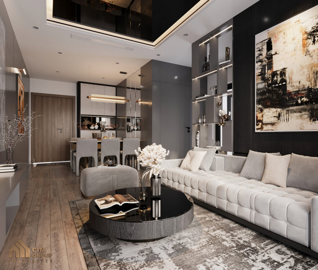 Ngay từ khi bước vào căn hộ, ấn tượng đầu tiên chính là không gian mở kết nối liền mạch giữa phòng khách, khu bếp và bàn ăn. Thiết kế này không chỉ giúp tối ưu diện tích mà còn tạo cảm giác rộng rãi, thoáng đãng hơn hẳn so với diện tích thực tế.Tone màu chủ đạo là xám trung tính, kết hợp với nội thất bọc nỉ màu sáng, ánh vàng nhẹ từ đèn thả trần và điểm nhấn tường đá marble tối sau TV – tạo nên một tổng thể sang trọng mà không quá lạnh lẽoHệ trần giật cấp và đèn hắt LED âm trần giúp phân lớp không gian một cách tinh tế, đồng thời tăng chiều sâu thị giác.Sàn lát gỗ và thảm màu trầm làm tôn lên nét thanh lịch của căn nhàBộ bàn ăn đặt giữa bếp và phòng khách, kiểu dáng hiện đại với mặt đá trắng vân mây và ghế bọc nỉ sáng màu.Thiết kế tối giản nhưng sang trọng, kết hợp đèn thả ánh vàng ấm phía trên, tạo nên không gian dùng bữa ấm cúng và tinh tế.