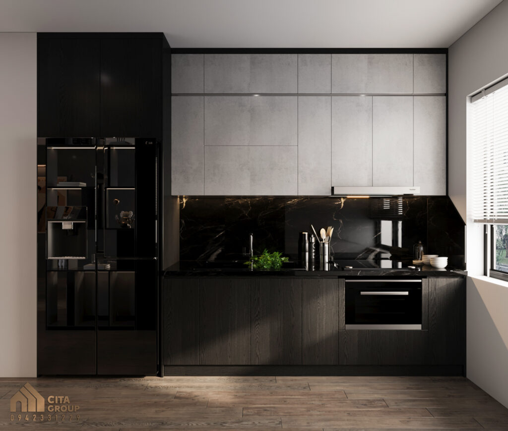 Bếp được thiết kế theo dạng chữ I nhỏ gọn, kết hợp đảo bếp kiêm bàn ăn rất hợp lý. Tích hợp đầy đủ các thiết bị hiện đại như lò nướng, máy hút mùi, tủ lạnh âm, cùng kệ mở để đồ khô, tiện lợi và gọn gàng.Hệ tủ bếp kịch trần, sử dụng chất liệu laminate chống bám vân tay, chia thành 2 tone đen – xám nhạt giúp tạo chiều sâu và sự sạch sẽ cho khu vực nấu nướng.