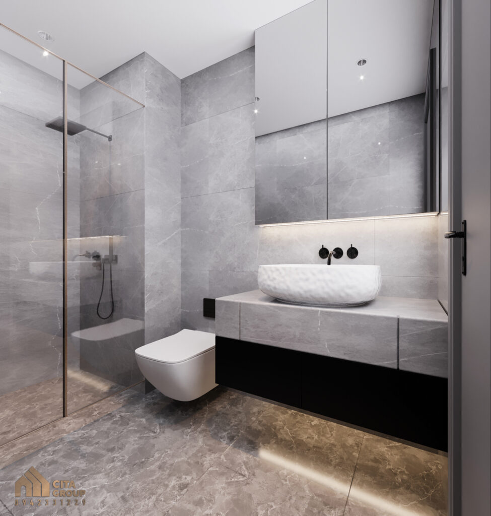 Hai phòng vệ sinh trong căn hộ được thiết kế với vật liệu gạch vân đá xám, kính trong suốt và thiết bị vệ sinh cao cấp, đảm bảo yếu tố thẩm mỹ và tiện nghi.Không gian tuy nhỏ nhưng được bố trí khoa học: lavabo đặt nổi trên tủ, bồn cầu treo, vách kính tắm đứng – vừa tiện lợi, vừa dễ vệ sinh.