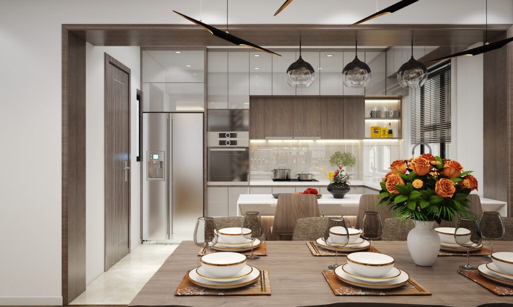 Phòng ăn liên thông với phòng khách và bếp, sử dụng bộ bàn ghế dài chất liệu gỗ công nghiệp phủ veneer cao cấp, phù hợp cho những bữa ăn gia đình ấm cúng hoặc tiếp khách nhẹ nhàng.Đèn thả hiện đại giúp phân vùng không gian tinh tế và tăng thêm tính thẩm mỹ.Ban công tiếp giáp với khu phòng ăn được bài trí đơn giản, thêm chút cây xanh làm góc chill chill.
