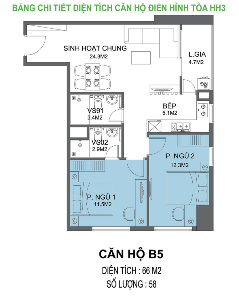 – Vệ sinh 2: 3,3 m2