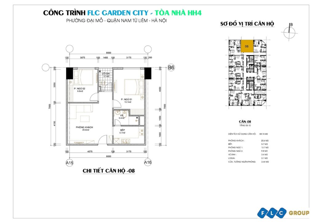 – Diện tích căn hộ: 58,74 m2