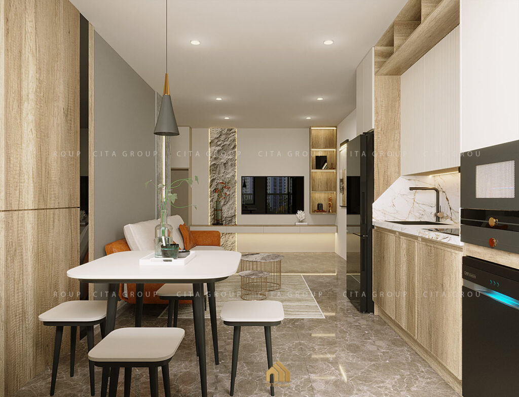 Liền kề phòng khách là khu vực bếp và bàn ăn – thiết kế mở không chỉ tối ưu diện tích mà còn tạo cảm giác kết nối giữa các thành viên trong gia đình.Bếp được bố trí hình chữ L, sử dụng tủ gỗ công nghiệp kết hợp tay nắm âm mang đến vẻ ngoài liền mạch và hiện đại. Màu gỗ sồi sáng phối cùng bề mặt bếp và tường ốp đá sáng màu giúp khu vực nấu nướng luôn sạch sẽ và thoáng đãng.Bàn ăn nhỏ gọn, kiểu quầy bar 4 ghế được đặt ngay sát bếp, thuận tiện cho các bữa ăn thường nhật hay những buổi trò chuyện cuối ngày.