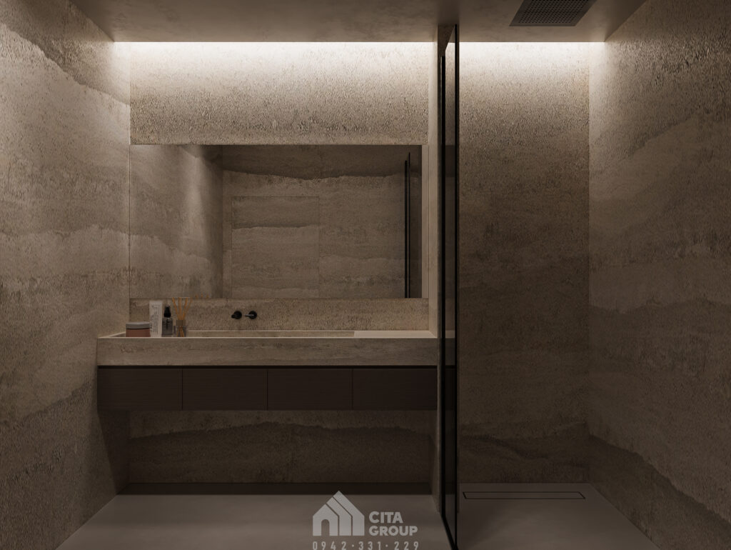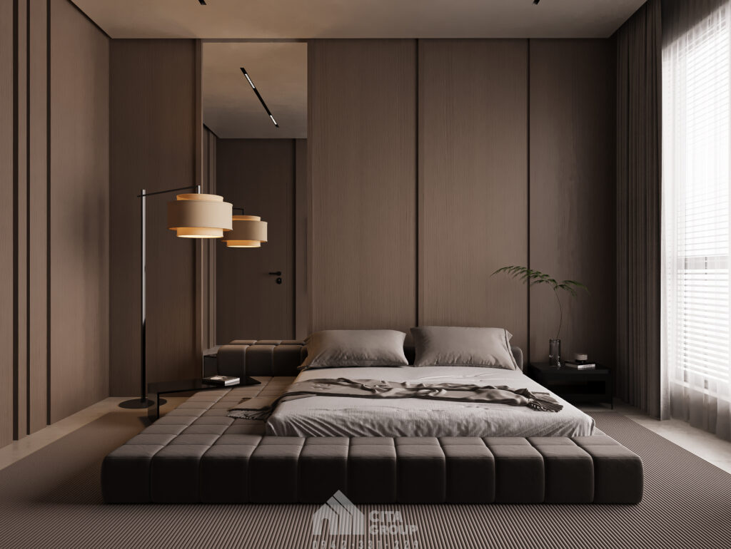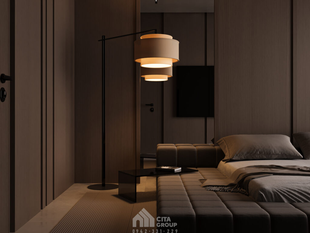 Phòng ngủ là nơi để bạn tìm về sự bình yên sau một ngày dài. CITA Group đã tạo ra một không gian nghỉ ngơi thoải mái và thư thái với gam màu dịu nhẹ và cách bố trí nội thất khoa học. Gia chủ mong muốn phòng ngủ chỉ là nơi để ngủ và nghỉ ngơi, nên chúng tôi đã cố gắng tiết chế các đồ nội thất sử dụng ở không gian này. Sử dụng chiếc giường ngủ kiểu dáng hiện đại đơn giản, chiều cao chỉ hơn 20 cm, bên trên đặt một chiếc nệm trắng nhỏ êm ái sẽ mang đến giấc ngủ ngon và sâu.Đèn ngủ đầu giường kiểu dáng độc đáo với kích thước lớn và chiều cao nổi trội với ánh sáng vàng ấm áp tạo cảm giác thư thái và dễ chịu. Rèm cửa hai lớp giúp điều chỉnh ánh sáng tự nhiên và đảm bảo sự riêng tư.Khu vực tủ quần áo và thay đồ được đặt riêng một góc khác trong phòng. Đối diện tủ quần áo là một chiếc bàn làm việc cùng với ghế nhỏ. Nên dù là cùng trong 1 phòng nhưng không gian nghỉ ngơi và làm việc được tách bạch rõ ràng.Phòng tắm được thiết kế hiện đại với các thiết bị vệ sinh cao cấp và cách bố trí khoa học, mang đến sự tiện nghi tối đa cho người sử dụng. Gam màu trắng sáng kết hợp với các chi tiết màu gỗ hoặc kim loại tạo nên vẻ đẹp xám vân của đá ốp tường tới lavabo và gạch sàn có tông màu đồng bộ vừa sạch sẽ và sang trọng.