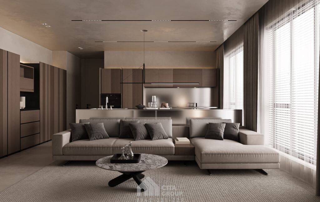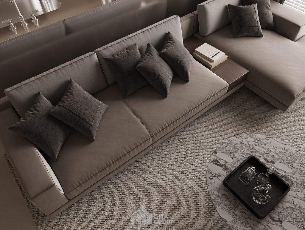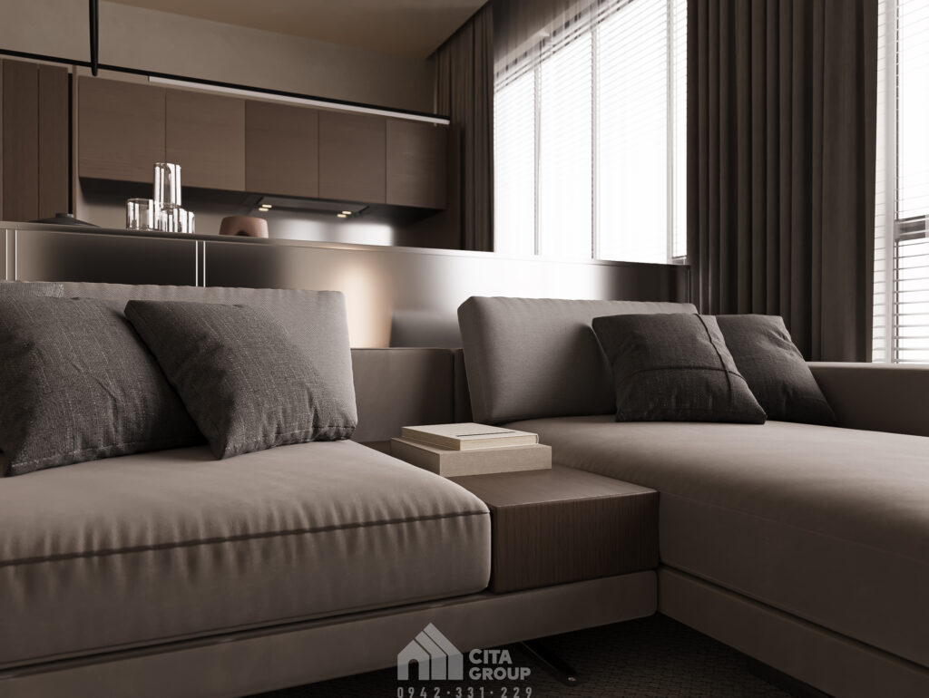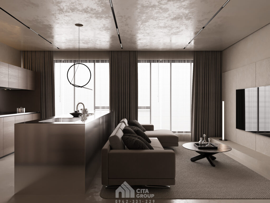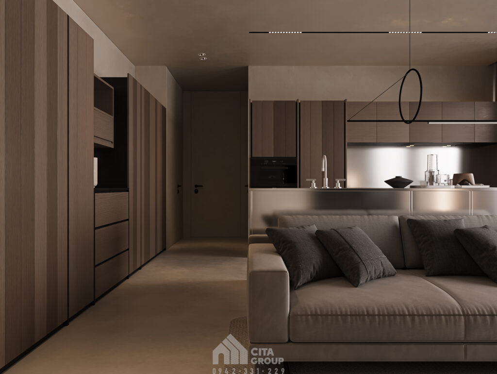 Ngay khi bước chân vào căn hộ, bạn sẽ cảm nhận được sự liền mạch và thông thoáng giữa các khu vực chức năng. Với diện tích không quá lớn, CITA Group đã khéo léo loại bỏ những vách ngăn không cần thiết, tạo ra một không gian mở, nơi phòng khách, bếp và khu vực ăn uống hòa quyện một cách tự nhiên.Chiếc sofa chữ L rãi và êm ái chiếm trọn sự chú ý, trở thành tâm điểm của phòng khách. Chất liệu mềm mại mời gọi bạn thả mình thư giãn sau một ngày dài. Những chiếc gối tựa đơn sắc, đồng điệu với màu sofa, tạo nên một tổng thể hài hòa và trang nhã. Độ rộng rãi của sofa cho phép bạn ngả lưng chợp mắt một cách thoải mái như đang nằm trên chiếc giường êm ái.Phòng khách được thiết kế theo phong cách tối giản nhưng vẫn toát lên vẻ sang trọng và ấm áp. Hệ thống đèn chiếu sáng được bố trí khoa học, kết hợp giữa ánh sáng tự nhiên từ cửa sổ lớn và ánh sáng nhân tạo từ đèn trần, đèn sàn hoặc đèn bàn, tạo nên không gian ấm cúng và thư giãn vào buổi tối.