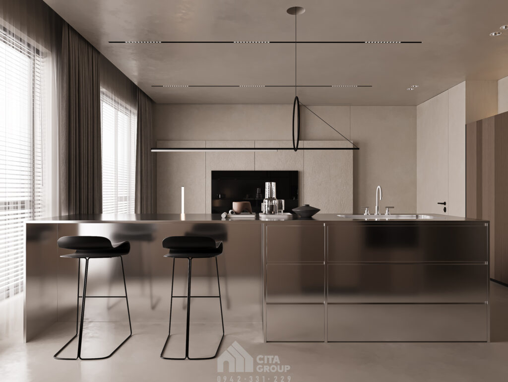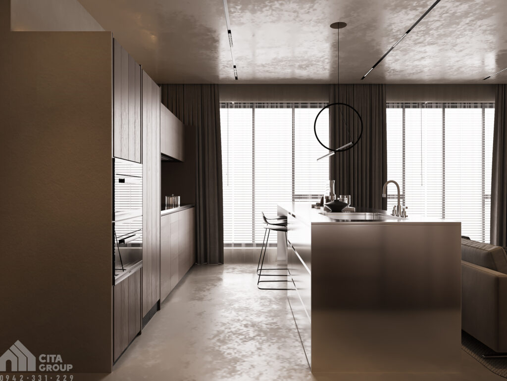 Khu vực bếp được thiết kế thông minh và tiện nghi, tận dụng tối đa không gian. Tủ bếp chữ I với chất liệu gỗ công nghiệp hiện đại không chỉ cung cấp không gian lưu trữ rộng rãi mà còn mang đến vẻ đẹp thẩm mỹ cao. Thay vì một bộ bàn ăn riêng biệt, đảo bếp được thiết kế với kích thước lớn, mặt đá rộng rãi và tích hợp khu vực ngồi như quầy thoải mái. Đây chính là “trái tim” của căn hộ, nơi mọi hoạt động ẩm thực và thư giãn đều diễn ra một cách tự nhiên và tiện lợi.Mặt đảo bếp rộng rãi là không gian lý tưởng để sơ chế thực phẩm và bày biện các món ăn. Bếp từ hoặc bếp điện âm tủ được lắp đặt gọn gàng, đảm bảo tính thẩm mỹ và an toàn. Một phần đảo bếp được bố trí những chiếc ghế бар cao, tạo thành một quầy bar mini ấm cúng. Gia chủ có thể thoải mái thưởng thức bữa ăn nhanh, nhâm nhi ly nước, đọc sách hoặc trò chuyện cùng bạn bè ngay tại đây.Phòng khách và phòng bếp cách nhau mỗi quầy đảo. Bên dưới mặt đảo bếp được thiết kế các ngăn tủ và hộc kéo đa năng, giúp gia chủ lưu trữ đồ dùng nhà bếp một cách gọn gàng và tiện lợi.