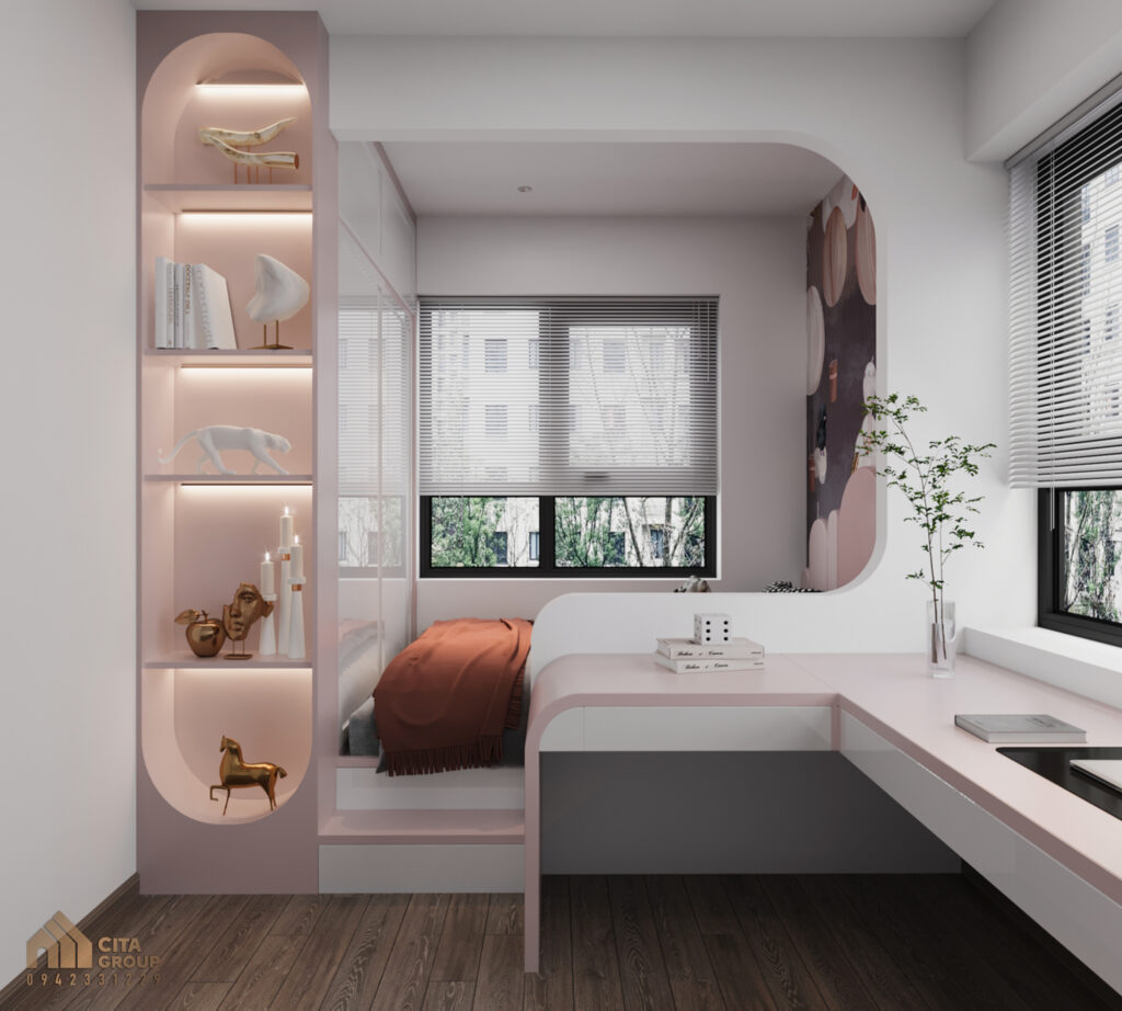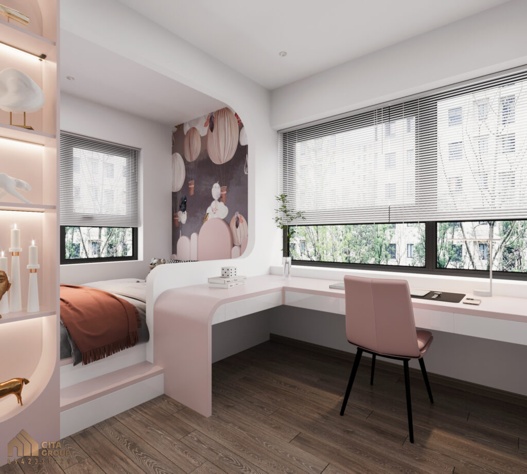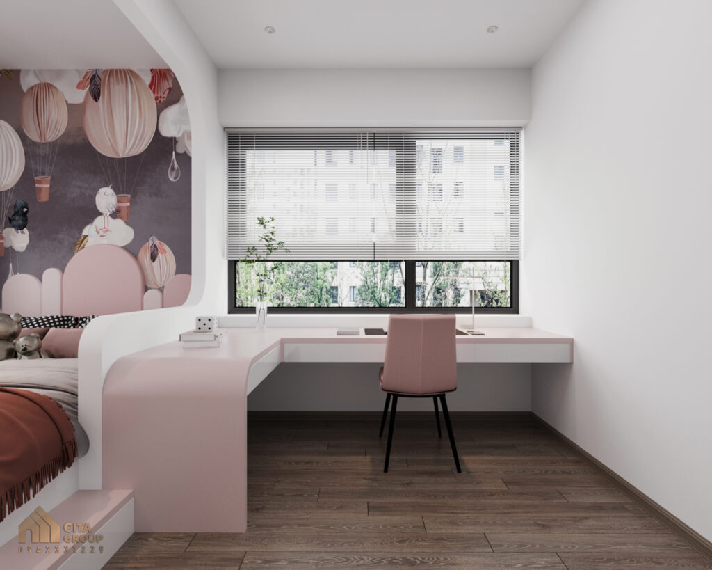 Dù diện tích phòng ngủ nhỏ, nhưng trong thiết kế nội thất căn hộ 2 ngủ The Charm An Hưng, mỗi không gian đều được tối ưu hóaPhòng ngủ của bé được trang bị một chiếc bàn học nhỏ gọn, tích hợp ngăn kéo và kệ để sách, đồ dùng học tập, giúp tiết kiệm không gian mà vẫn đảm bảo tính năng.Các món đồ nội thất như giường và tủ quần áo đều có thiết kế đơn giản, dễ dàng kết hợp với màu sắc nhẹ nhàng và trang trí dễ thương để tạo một không gian vui tươi, sáng tạo cho bé. Bằng cách này, phòng ngủ không chỉ gọn gàng mà còn tạo ra không gian học tập và nghỉ ngơi thoải mái cho trẻ.