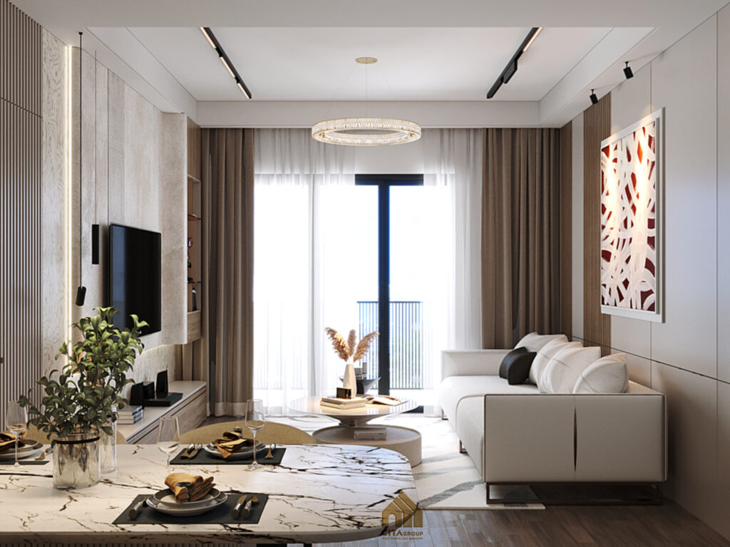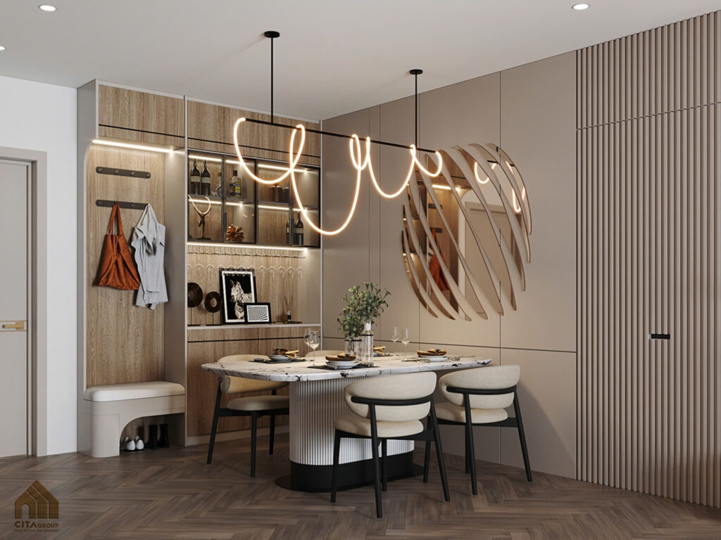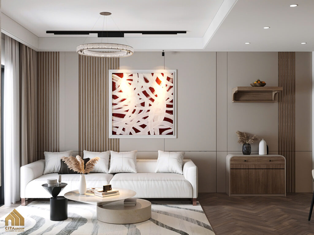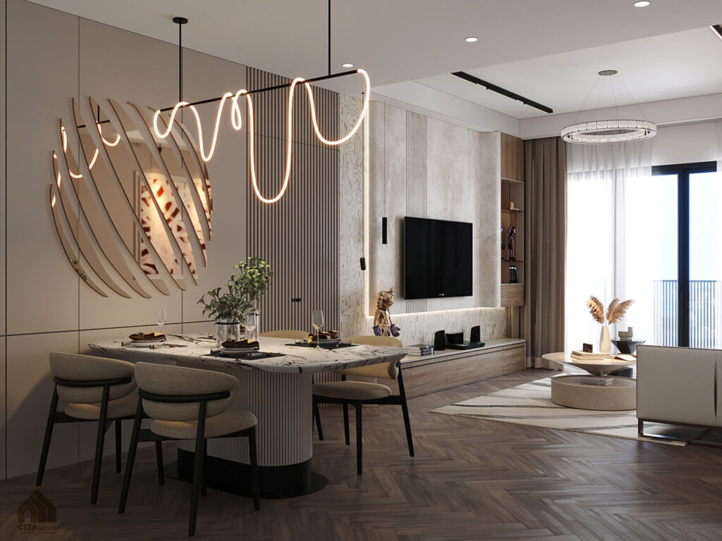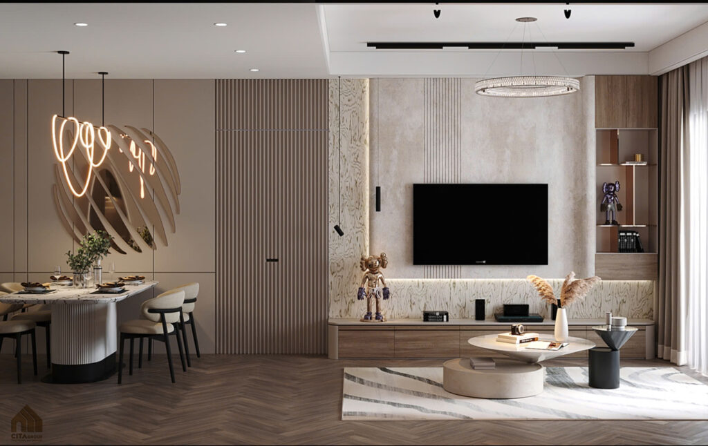 Không gian sinh hoạt chính được thiết kế mở, kết nối mượt mà giữa phòng khách và bàn ăn.Sofa chữ L màu trắng nổi bật trên nền sàn gỗ nâu trầm, tạo nên sự cân bằng giữa sự sang trọng và gần gũi. Tranh treo tường khổ lớn với sắc cam đỏ trở thành điểm nhấn nổi bật, mang hơi thở nghệ thuật vào không gian.Khu bàn ăn đặt liền mạch với phòng khách, sử dụng đèn thả nghệ thuật hình xoắn mềm mại, tăng sự sinh động cho không gian sum họp.Kệ TV ốp gỗ và laminate bóng mờ kết hợp hệ tủ trưng bày, đáp ứng cả nhu cầu lưu trữ lẫn thẩm mỹ.Khu bàn ăn đặt liền mạch với phòng khách, sử dụng đèn thả nghệ thuật hình xoắn mềm mại, tăng sự sinh động cho không gian sum họp.