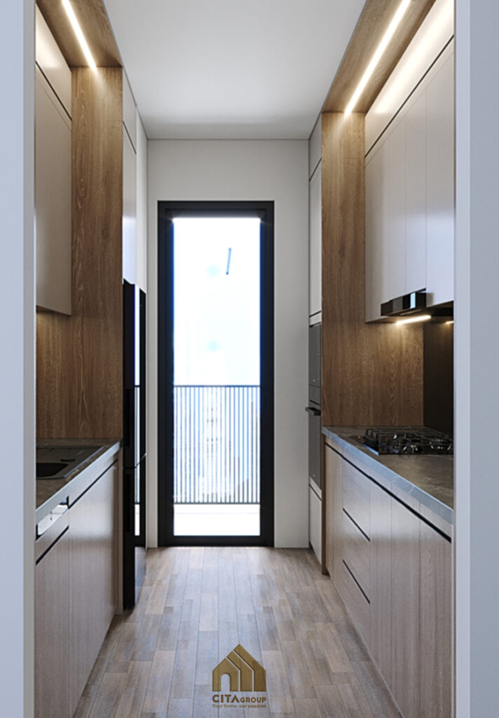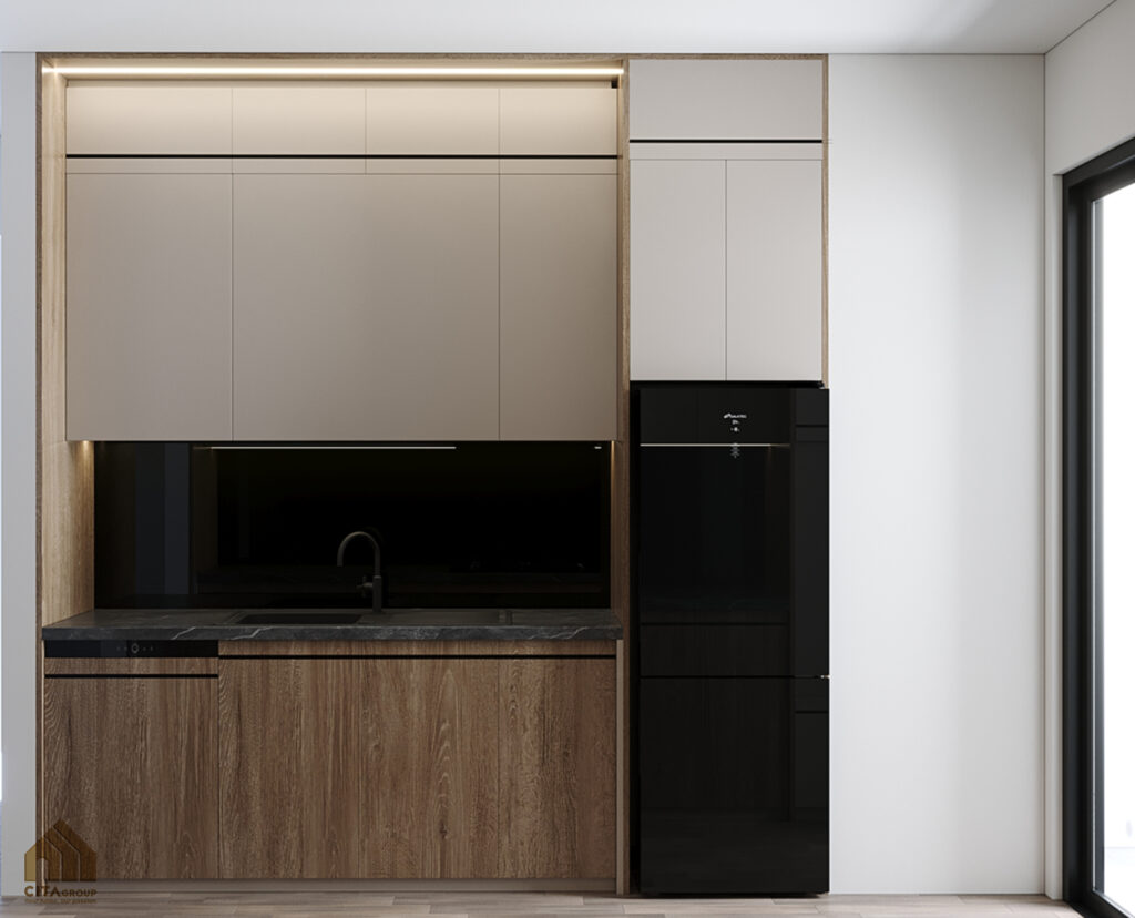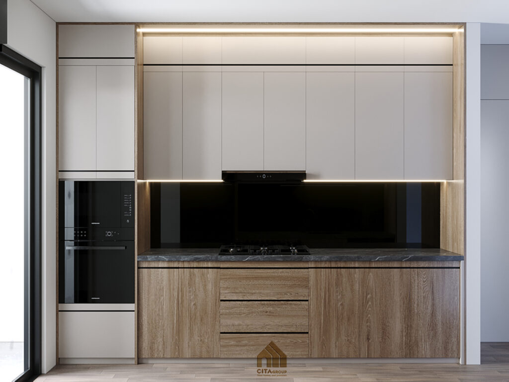 Không nối liền với phòng khách, khu bếp được bố trí riêng, đảm bảo sự ngăn nắp, hạn chế mùi lan sang không gian sinh hoạt:Thiết kế dạng hành lang hai bên, giúp người nội trợ dễ dàng thao tác theo trình tự: lấy đồ – sơ chế – nấu – rửa. Tủ bếp trên màu trắng, kết hợp tủ dưới vân gỗ tự nhiên và mặt đá đen, tạo sự tương phản hiện đại mà vẫn ấm cúng.Đầy đủ thiết bị như bếp âm, chậu rửa, tủ lạnh, lò nướng… được sắp đặt khoa học. Ánh sáng đèn hắt từ dưới tủ trên giúp tăng độ sáng khi nấu và tạo chiều sâu không gian.