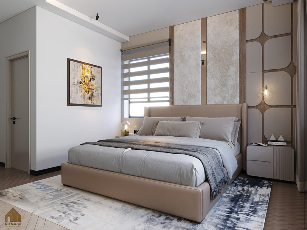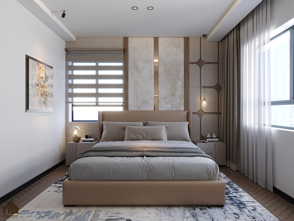 Không gian phòng ngủ chính thể hiện phong cách tối giản hiện đại nhưng vẫn đầy cảm xúc: Giường lớn bọc nệm be nhạt, phần đầu giường ốp da kết hợp nẹp inox và đá giả marble, tạo hiệu ứng sang trọng.Hai bên giường bố trí tab đầu giường nhỏ và đèn thả trang trí, tăng chiều sâu không gian và ánh sáng dịu nhẹ. Tủ quần áo âm tường, thiết kế chạm trần với tay nắm âm hiện đại, giúp tối ưu diện tích và giữ sự gọn gàng.Cửa sổ lớn cùng rèm cầu vồng hai lớp, điều chỉnh ánh sáng linh hoạt, đảm bảo không gian luôn thoáng và dễ chịu.