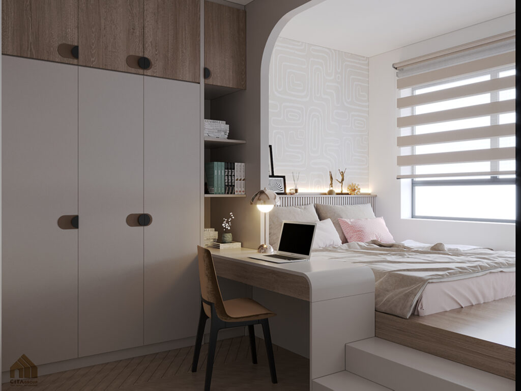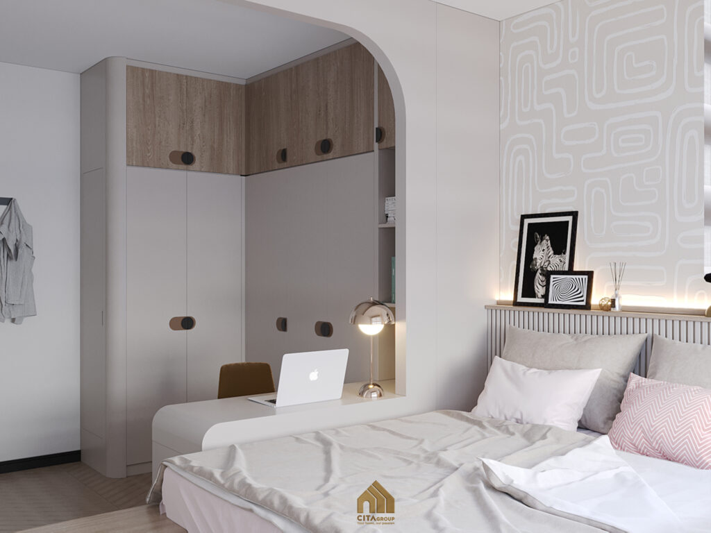 Dành cho con nhỏ hoặc dùng làm phòng làm việc/học tập, phòng ngủ phụ mang hơi hướng trẻ trung và tiện nghi. Giường đơn tích hợp ngăn kéo lưu trữ phía dưới, giữ không gian luôn ngăn nắp.Tường được trang trí bằng giấy dán họa tiết hình học tinh tế, tông màu trung tính dễ phối đồ. Tủ quần áo cao chạm trần, bố trí thêm các ngăn trên với cánh màu vân gỗ – tận dụng tối đa không gian lưu trữ.Góc bàn học nhỏ gọn liền giường, có đèn chiếu sáng riêng biệt, phù hợp cho việc học tập hoặc làm việc từ xa. Toàn bộ nội thất sử dụng đường nét bo tròn, đảm bảo an toàn nếu dành cho trẻ nhỏ.