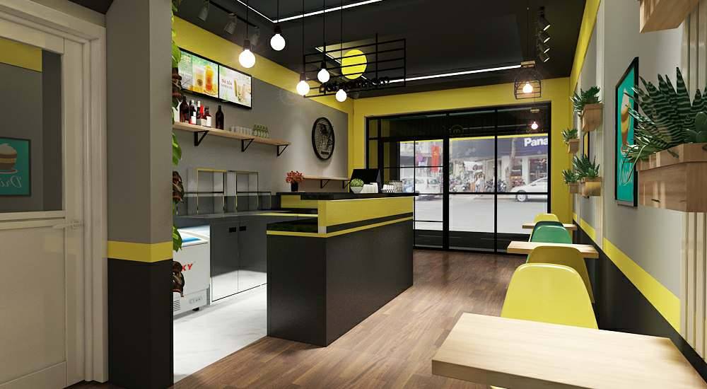 Không gian nội thất được thiết kế mở, bố trí bàn ghế linh hoạt với các dãy ghế tựa phối màu pastel và băng ghế dài sát tường – tối ưu diện tích mà vẫn tạo sự thoải mái. Tranh tường chữ nổi “Happiness is a cup of milk tea” cùng hệ đèn thả tạo điểm nhấn thị giác, phù hợp với tệp khách hàng trẻ tuổi.Quán nằm trong khu phố đông đúc, mặt tiền nhỏ nên nhóm thiết kế chọn tone vàng chanh phối đen, vừa gây ấn tượng thị giác mạnh, vừa bám sát bộ nhận diện thương hiệu. Hệ khung viền nổi bật bao quanh cửa kính lớn giúp khách dễ quan sát vào bên trong.Từ mặt tiền đến không gian bên trong, mỗi chi tiết đều được tính toán kỹ để tạo ra trải nghiệm dễ nhớ và dễ quay lại – đúng tinh thần “đẹp để bán, tối ưu để vận hành”.Ngay chỗ gần quầy gọi đồ được thiết kế bàn cao với những chiếc ghế bar cao để khách ngồi thưởng thức đồ uống.Góc nhìn từ cửa vào bên trong quán, toàn bộ không gian bên trong được bao quát, rõ hơn phần decor ở hai bên tường và bên trên chỗ quầy đồ uống.Gian ngoài cùng của quán, góc nhìn từ bên trong ra ngoài cửa chính, phần lớn khu ngoài để quầy đồ và tủ, một vài bàn cho khách ngồi được kê sát tường.
